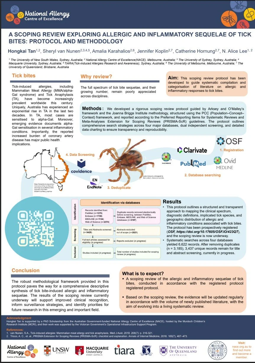 Hongkai Tan1,2, Sheryl van Nunen 2,3,4,5, Amalia Karahalios 2,6 , Jennifer Koplin 2,7, Catherine Hornung 2,7, N. Alice Lee 1, 2 The University of New South Wales, Sydney, Australia; 2 National Allergy Centre of Excellence (NACE), Melbourne, Australia; 3 The University of Sydney, Sydney, Australia; 4 Macquarie University, Sydney, Australia; 5 TiARA(Tick-induced Allergies Research and Awareness), Sydney, Australia; 6 The University of Melbourne, Melbourne, Australia; 7 The University of Queensland, Brisbane, Australia
